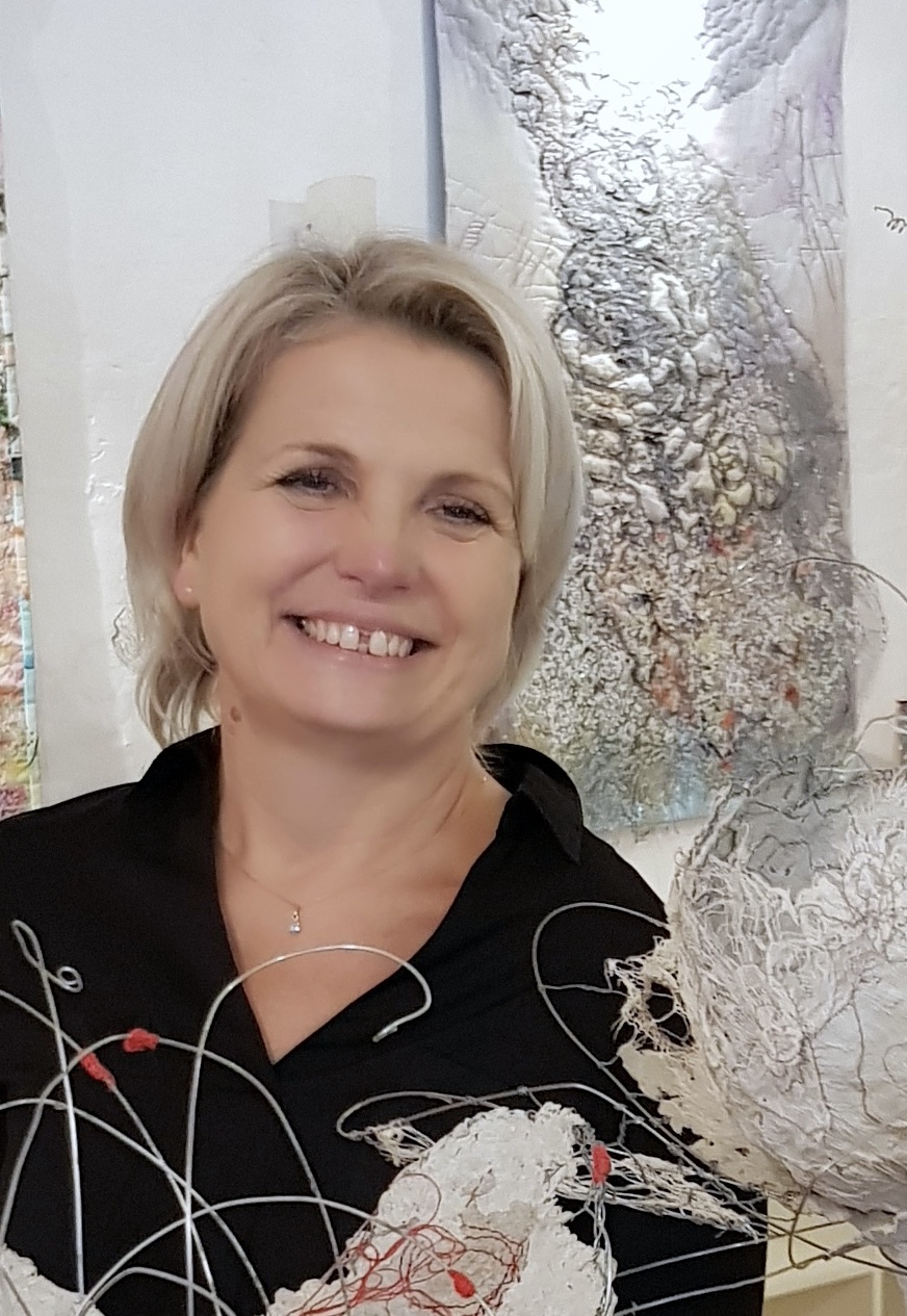 « Technique de nœuds, sans métier ni outils, juste des ciseaux. Je sculpte des cordes de toutes les sortes (raphia, coton, sisal, jute, lin, ficelle de papier, rayonne, nylon….) et des tissus découpés depuis 1981. Technique traditionnelle populaire très répandue en Amérique latine, le nœud ne s’apprend pas dans les écoles. Il se transmet comme le crochet de nos grands-mères, la transmission est donc orale. De la France où je suis née en 1959, en passant par la Côte d’Ivoire, pays de cœur et d’inspiration où j’ai vécu, avec des clins d’œil à l’Amérique latine pour cette technique, mes nœuds racontent une histoire : ce sont des nœuds de vie, complices de la vie… des nœuds qui résistent… Des nœuds qui servent de fil conducteur pour ne pas se perdre… Nouer pour dénouer le quotidien, et renouer autrement. Des instants de vie figés dans l’émotion d’une multitude de visages ».
